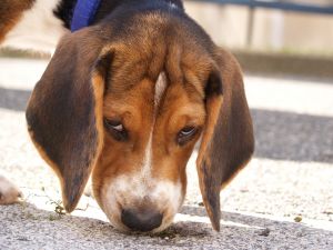 Dog using its nose to search a target scent (photo from http://www.houndcrazy.com).